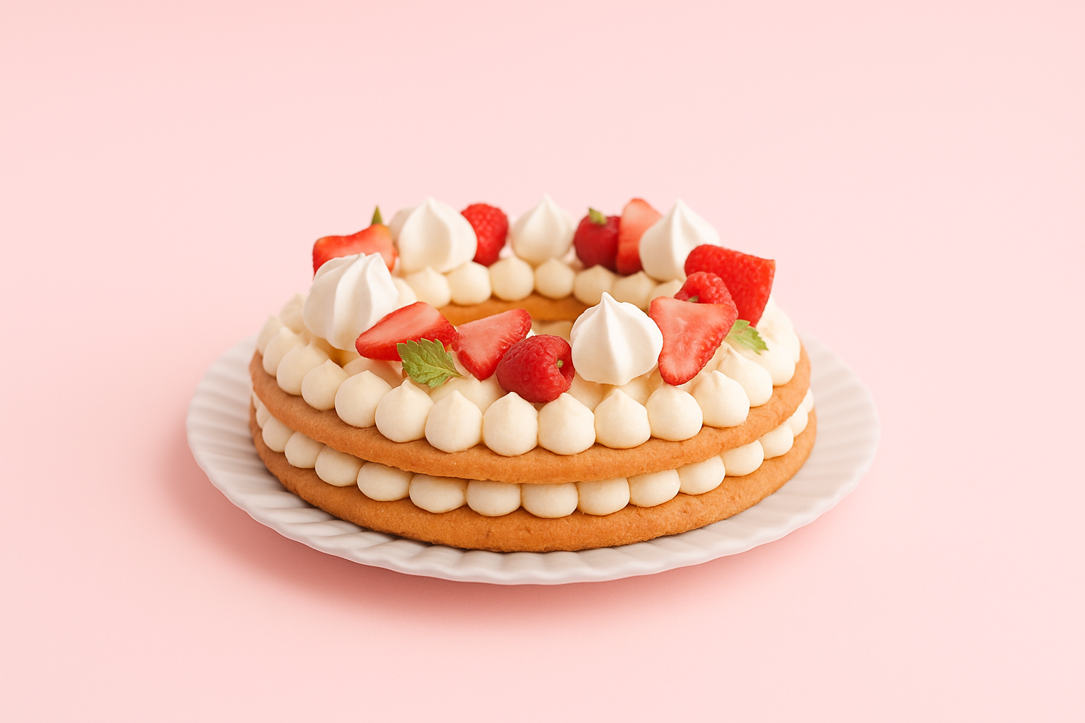 Biscottosa alla fragola è una torta rotonda formata da una gustosa base al biscotto farcita con panna fresca e fragole, la grammatura della torta e dai 1200/1500gm
