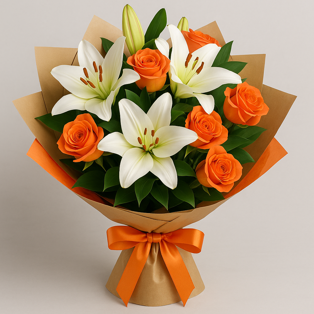 Un bouquet dal fascino intenso e vibrante, che unisce l’eleganza immacolata dei gigli bianchi all’energia vitale delle rose arancio. Un contrasto armonioso che regala emozioni forti e positive, perfetto per chi desidera sorprendere con un dono originale e ricco di significato.