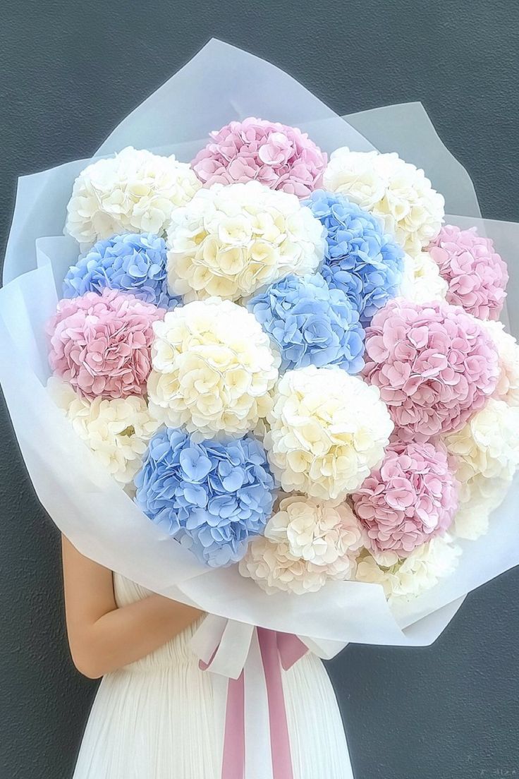 Bouquet con ortensie bianche, rosa e azzurre con verde e fiorellini di contorno, il tutto verrà confezionato regalo .