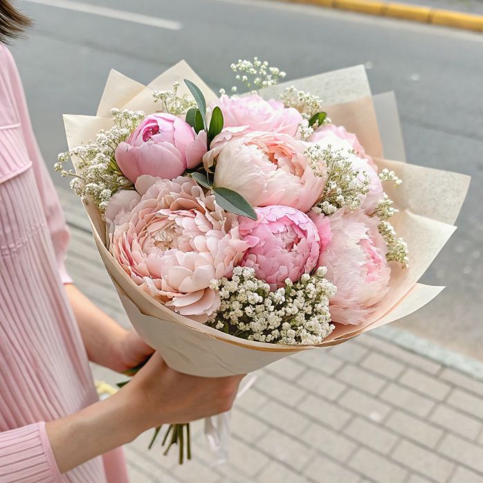 Bouquet con peonie rosa e verde e fiorellini di contorno, il tutto verrà confezionato regalo .