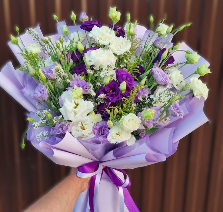 il Bouquet di Lisianthus è composto da soli lisianthus bianchi e viola, eucalipto e verde misto il tutto confezionato regalo con un vasetto in ceramica.