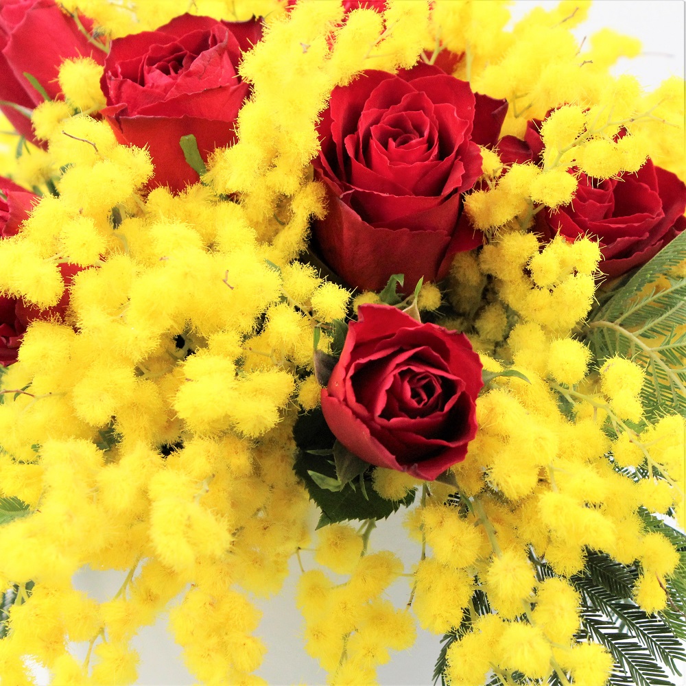 bouquet di rose dal colore a scelta e mimosa, eucalipto e verde misto il tutto confezionato regalo.
