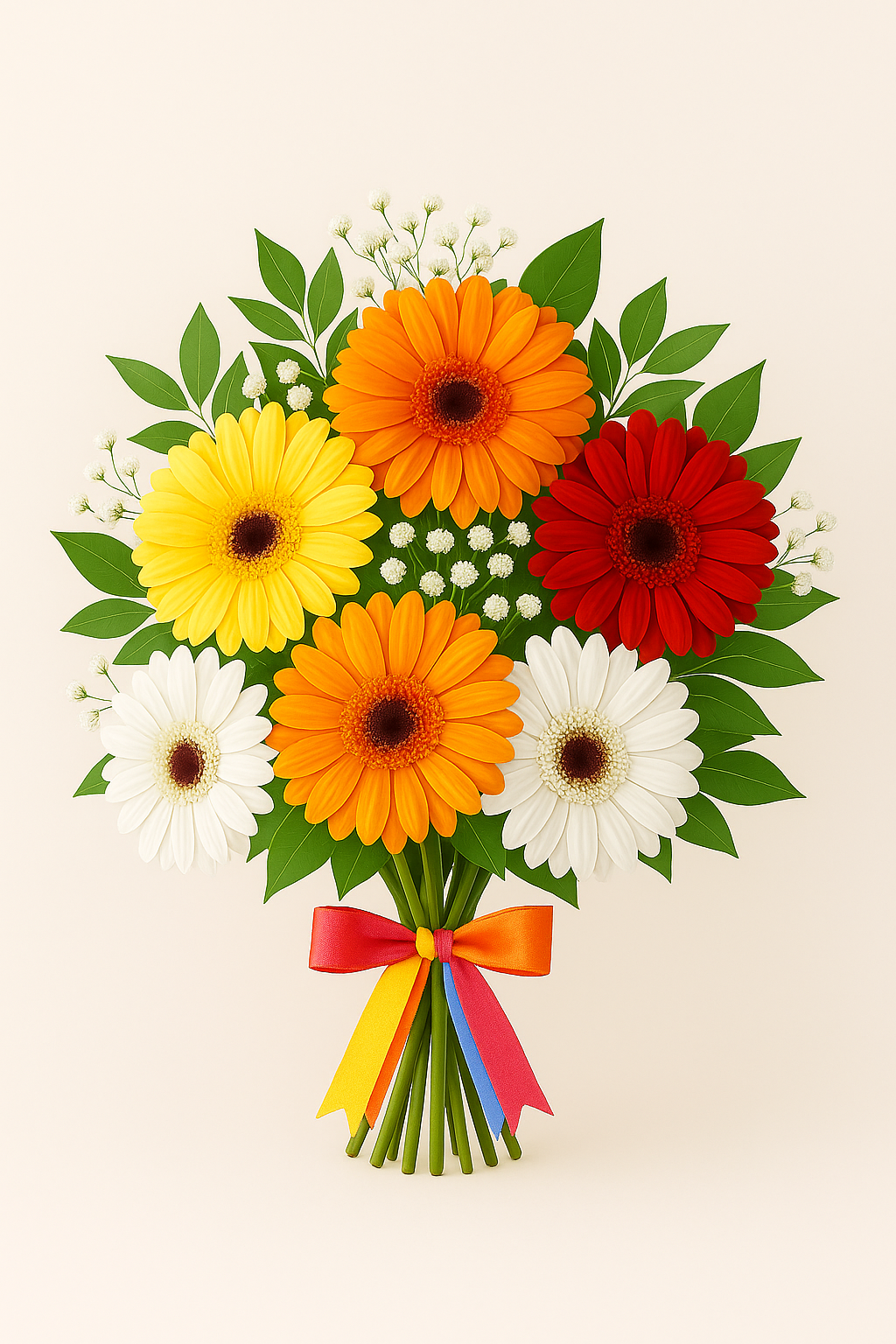 Questa composizione vivace unisce gerbere rosse, arancioni, gialle e bianche in un abbraccio armonioso, accompagnate da delicata gypsophila bianca (nebbia) e da foglie verdi fresche e lucenti. Il tocco finale? Un elegante fiocco arcobaleno che celebra la felicitร in tutte le sue sfumature.
