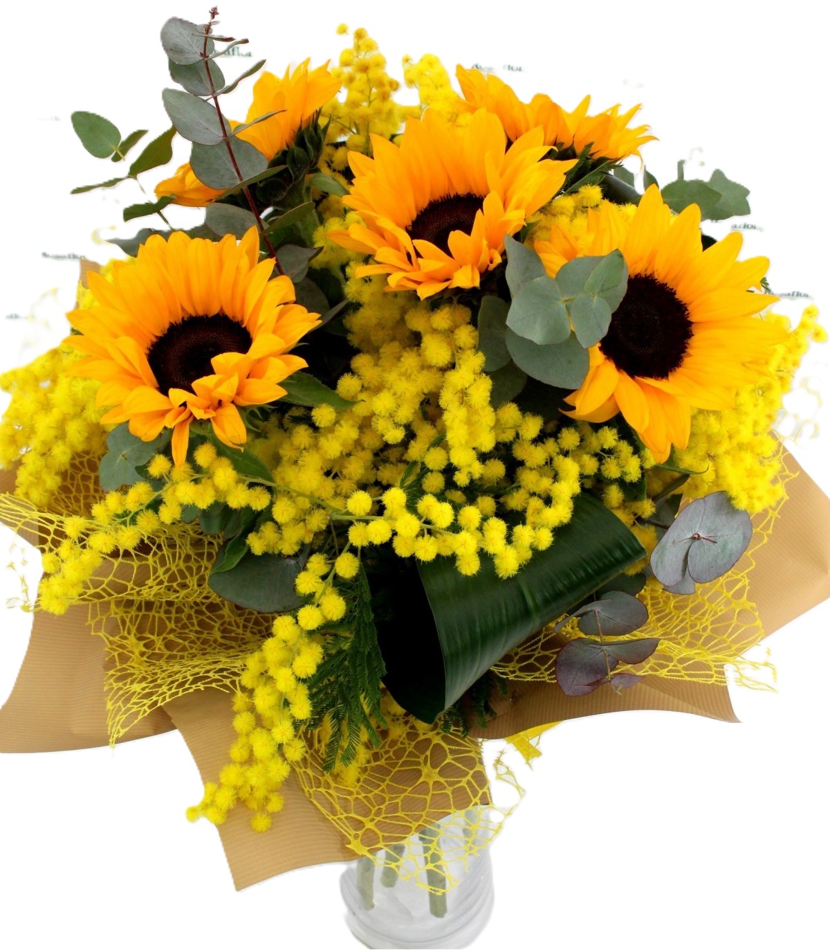 Il bouquet è composto da girasoli e mimosa eucalipto e verde misto il tutto confezionato regalo.
