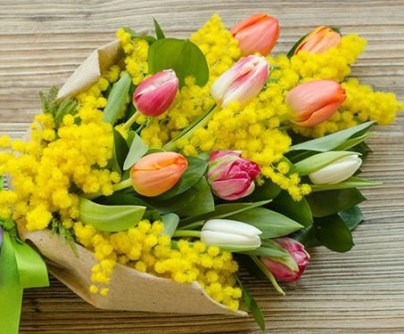 Il bouquet tulipano con mimosa è composto da tulipani colorati e Mimosa, eucalipto e verde misto il tutto confezionato regalo.