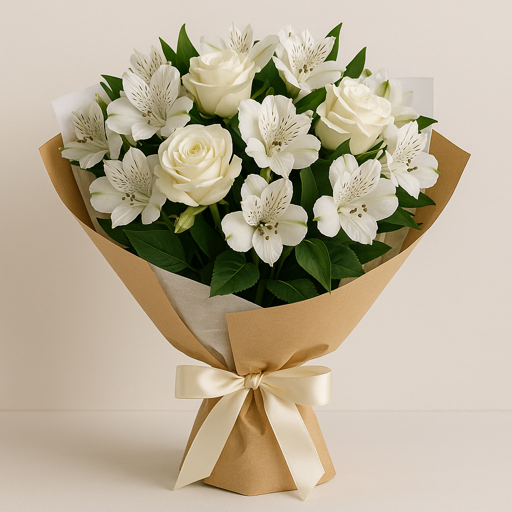 Un bouquet dal fascino candido e raffinato, che unisce la leggerezza dell’astromeria bianca alla bellezza senza tempo delle rose bianche. Un regalo perfetto per chi desidera trasmettere armonia, pace e amore sincero.