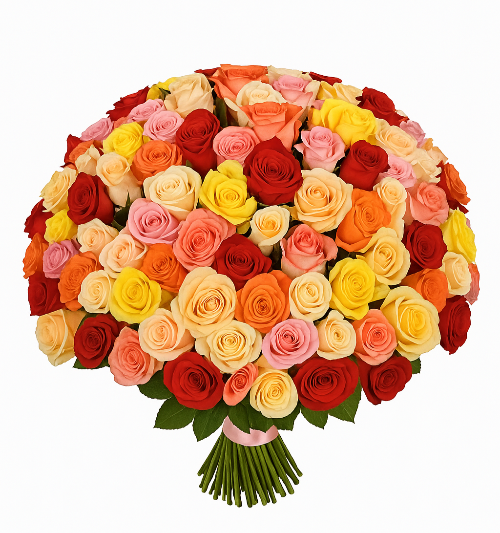 Il mazzo di rose colorate è composto da rose di 4/5 colori, verde decorativo e confezione.