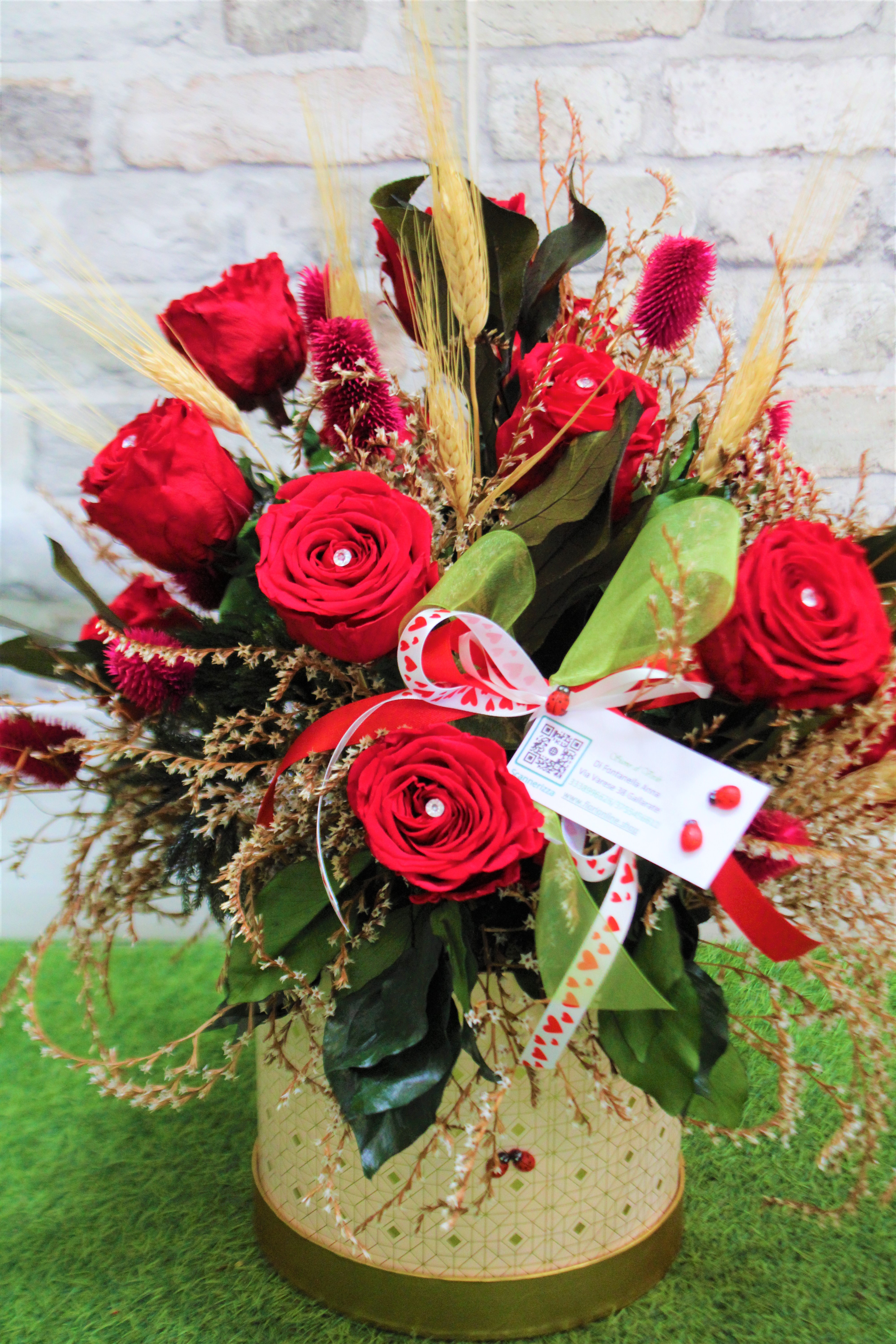 Il bouquet Stabilizzato è composto da fiori Veri che DURANO PER SEMPRE come roselline, Ginsopila, eucalipto e verde misto il tutto confezionato regalo.