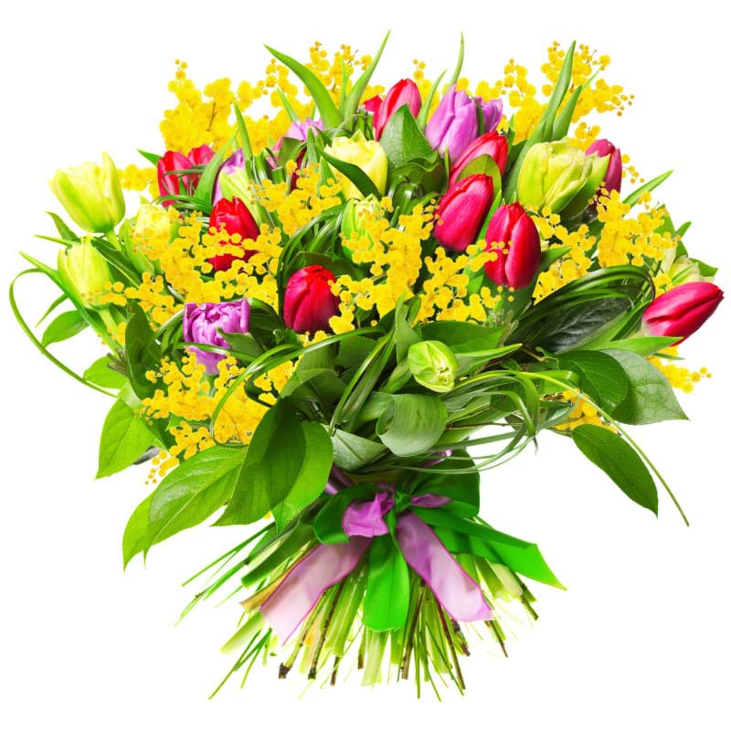 Il bouquet di tulipani è composto da tulipani misti colorati e mimosa, eucalipto e verde misto il tutto confezionato regalo.