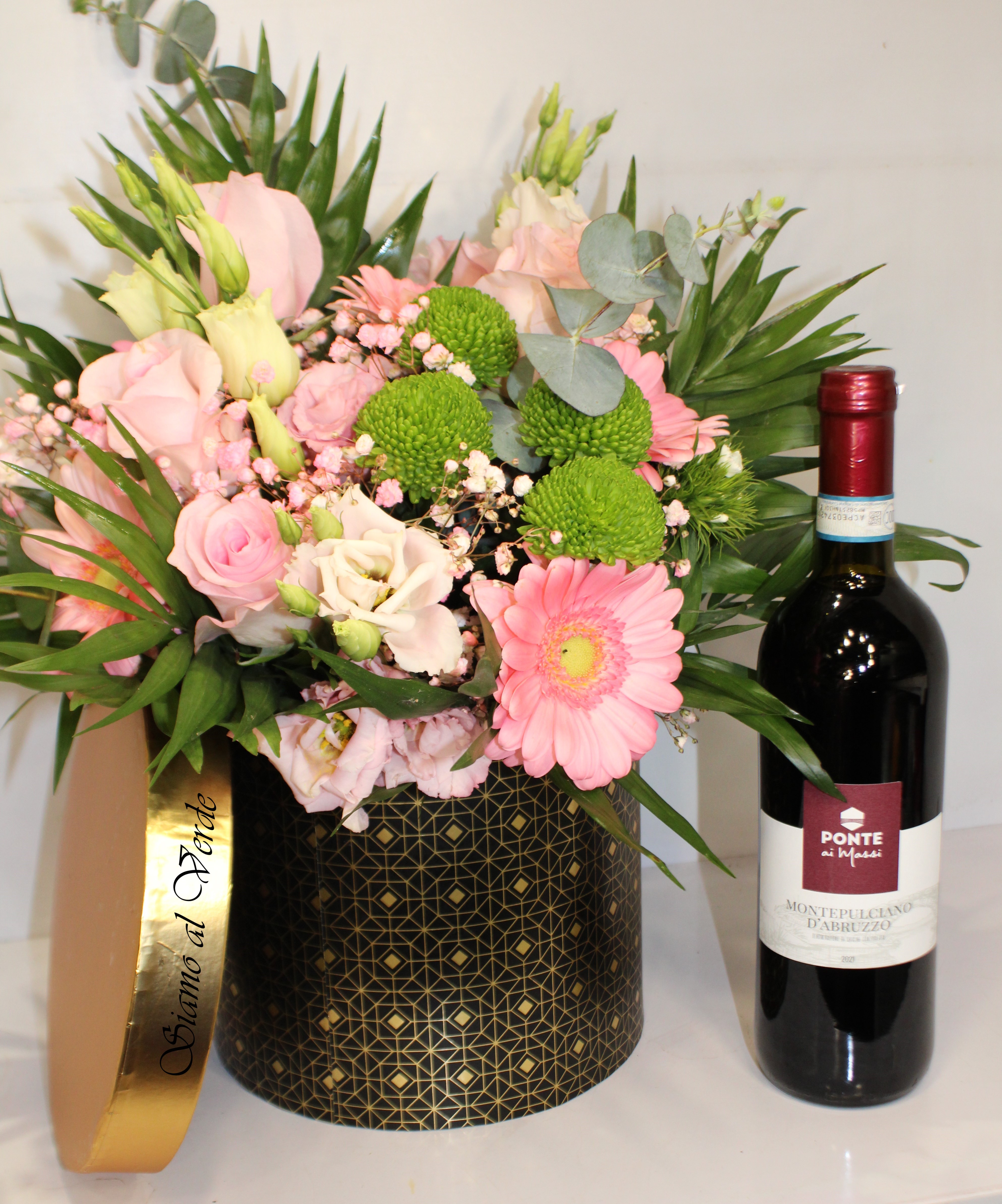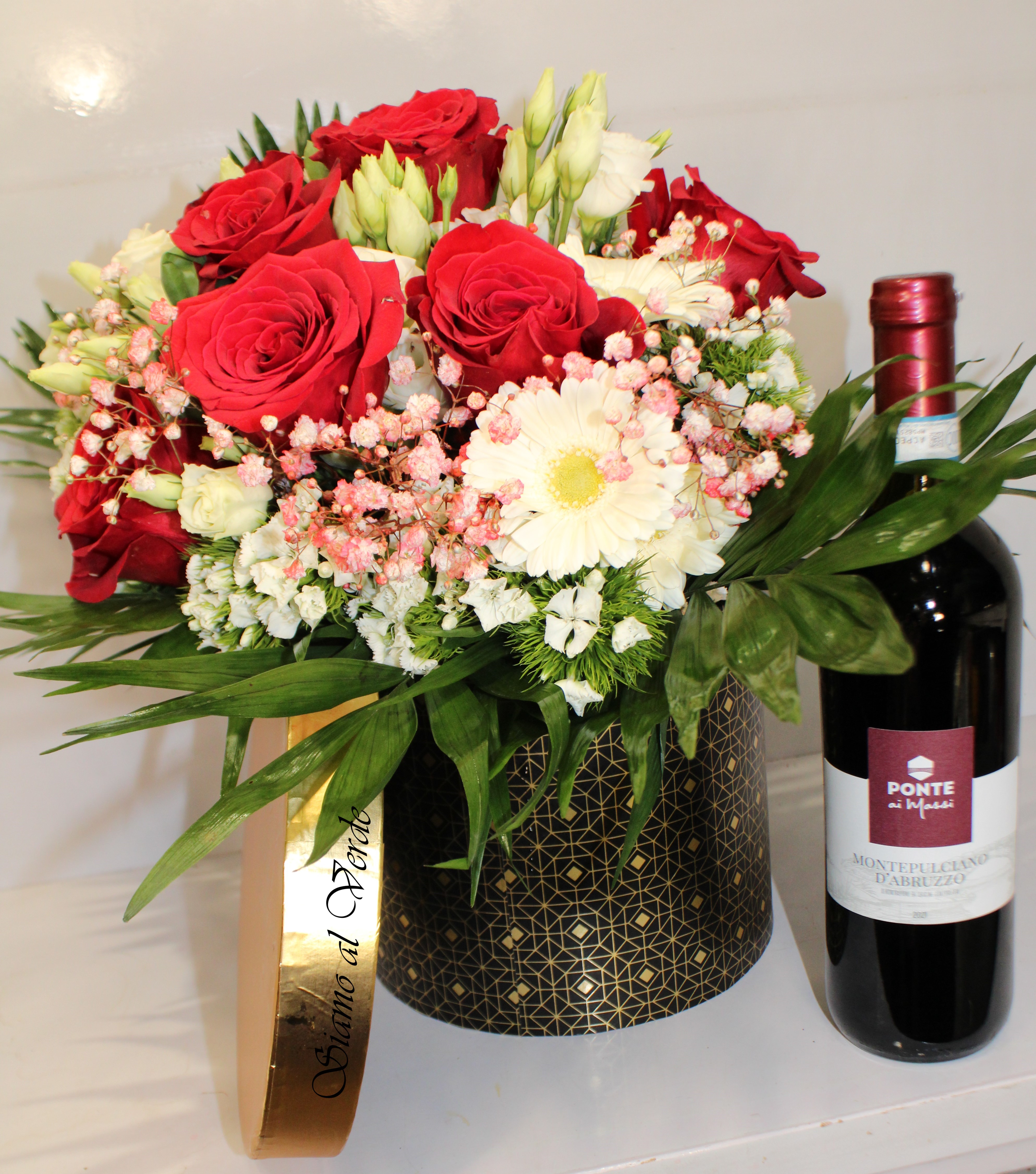 Composta da un bellissimo bouquet di misto fiori freschi, appoggiato nella nostra bellissima scatola rotonda Nera e oro, con aggiunta una bottiglia di Montepulciano d’Abruzzo da 750ml, imbottigliato e prodotto in Italia.