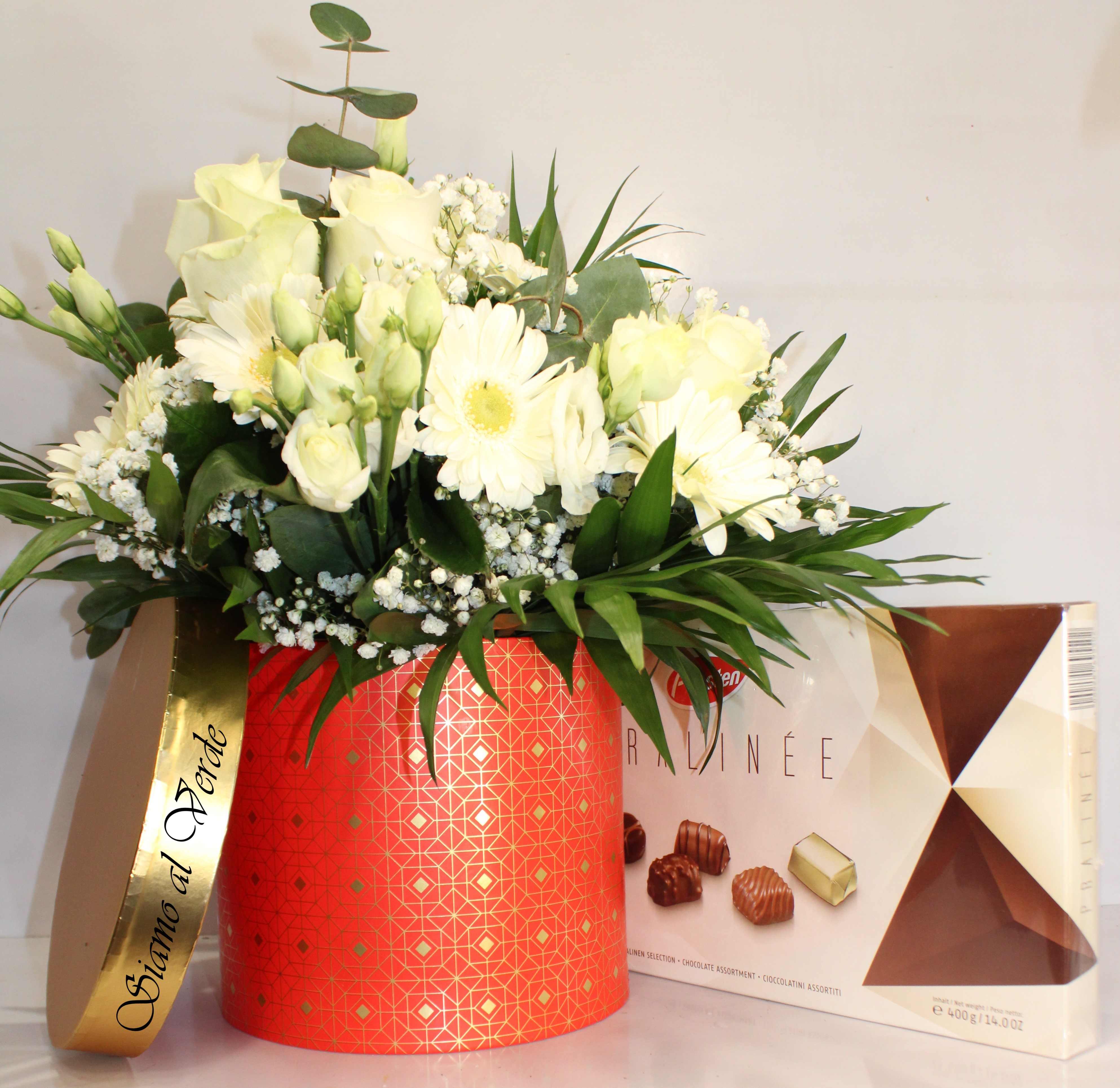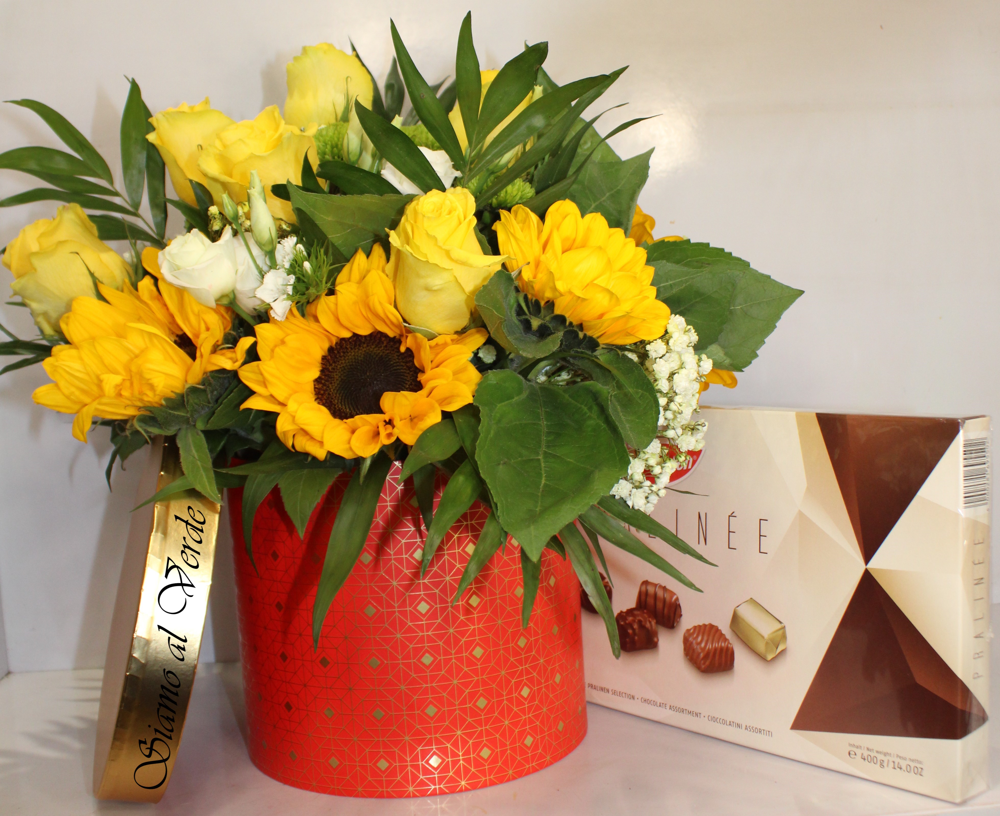 Composta da un bellissimo bouquet di misto fiori freschi, appoggiato nella nostra bellissima scatola rotonda Rosso e oro, accompagnato con una scatola ci cioccolatini assortiti da 400gm.