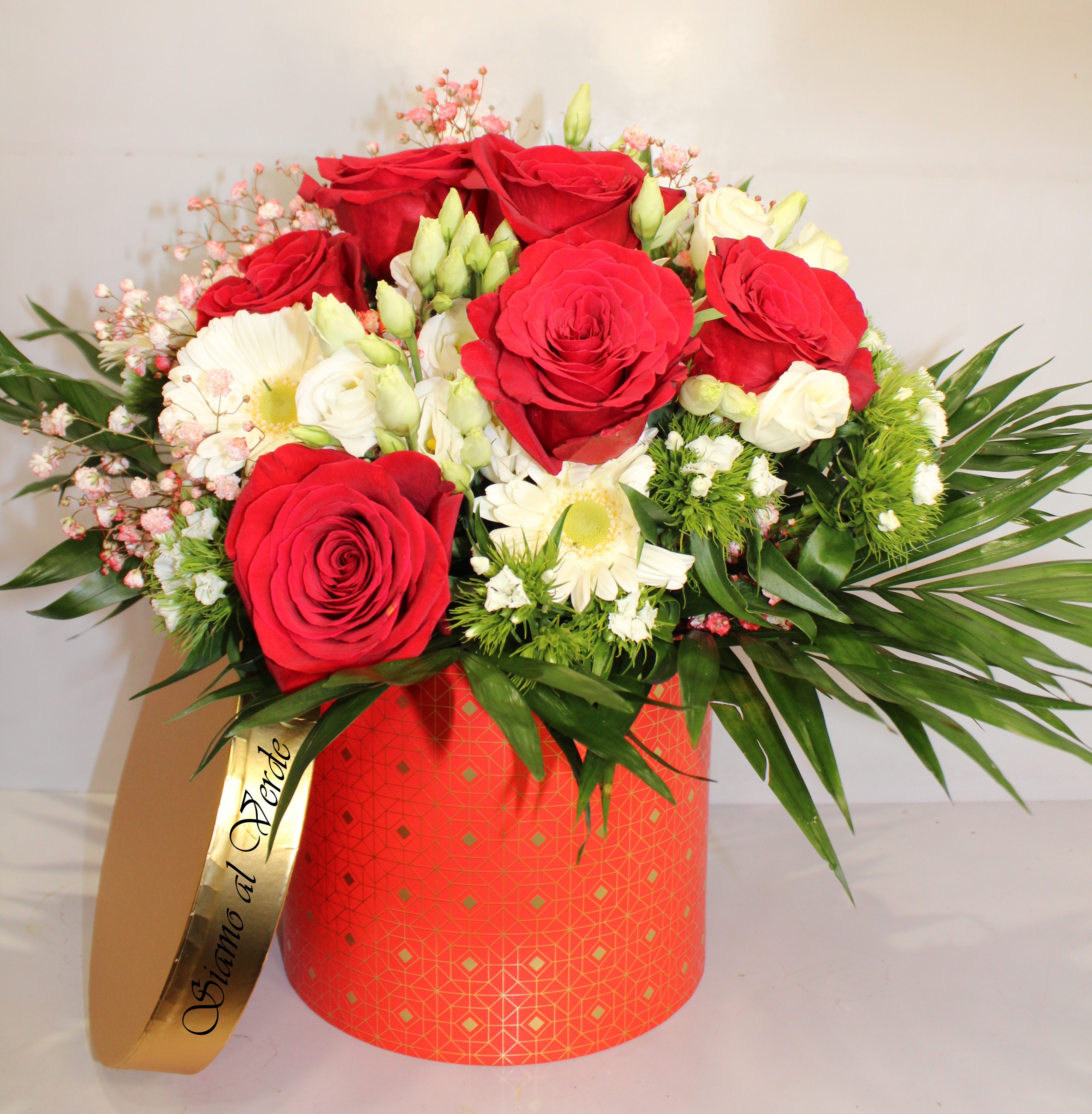 Composta da un bellissimo bouquet di misto fiori freschi, appoggiato nella nostra bellissima scatola rotonda Rossa e oro.