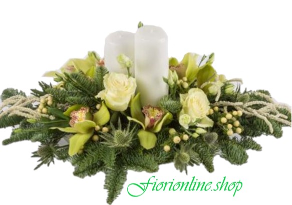 Il centrotavola Bianco con Orchidee รจ composto principalmente da una base di pino Irlandese, misto verde invernale e fiori invernali, 2 candele Bianche e plik natalizi il tutto confezionato regalo.