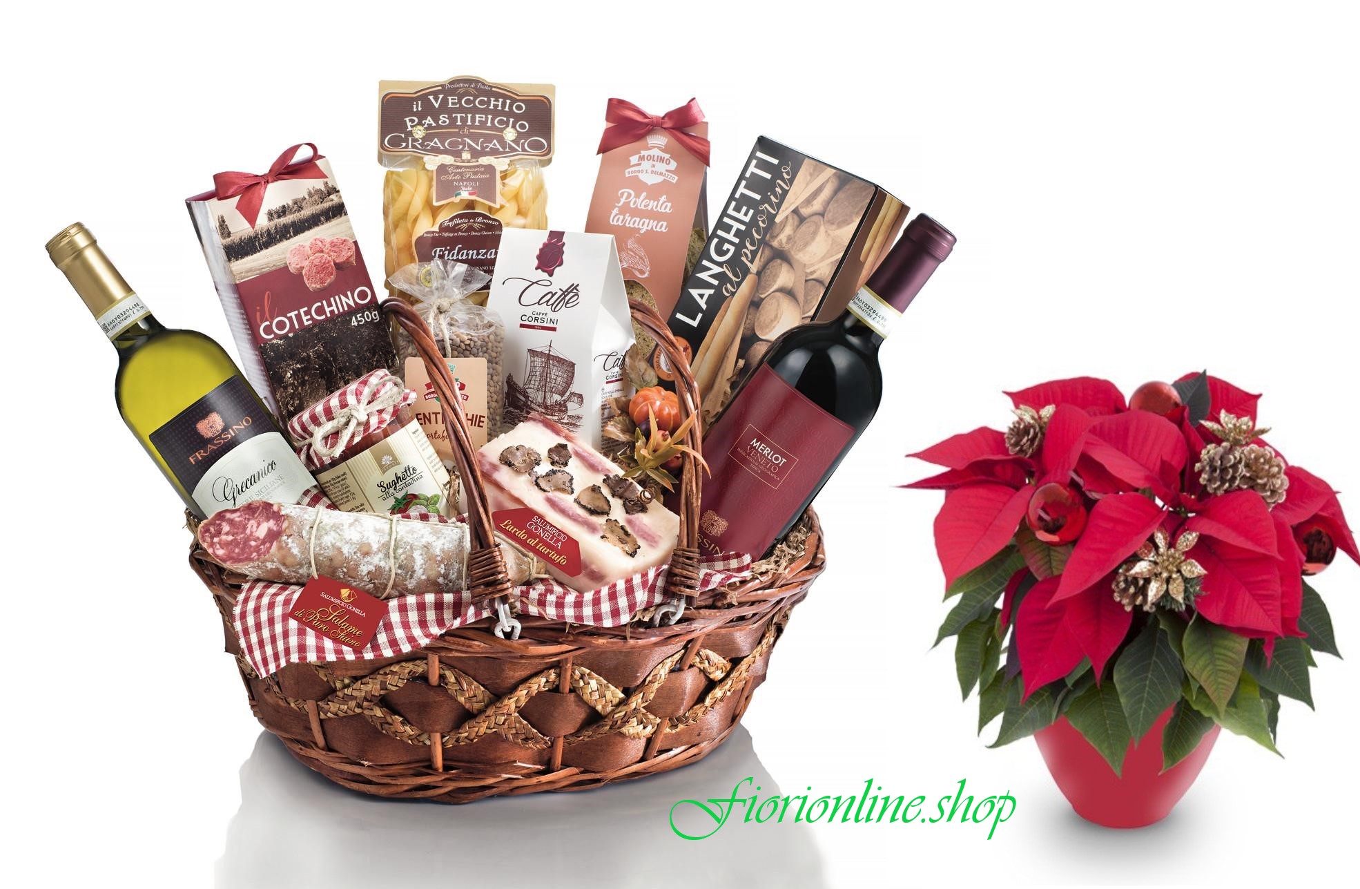 Fiorionline.shop non vi offre solo fiori ma anche splendidi Cesti regalo Alimentari di Natale si potrà scegliere se aggiungere una bellissima stella di Natale.