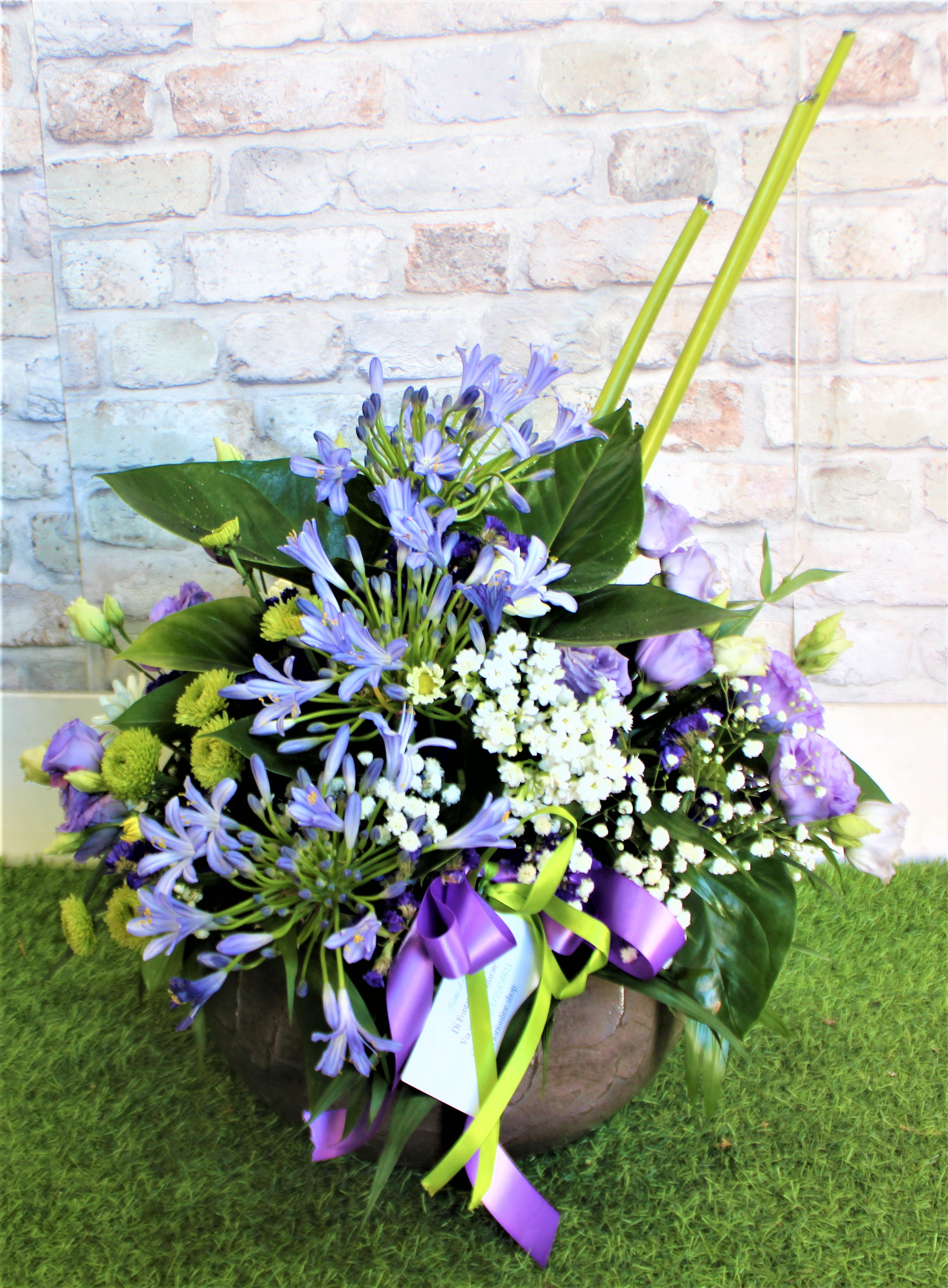 La composizione e composta da una ciotola in ceramica o cestino a Disponibilità del fiorista, Fiori freschi di stagione.
