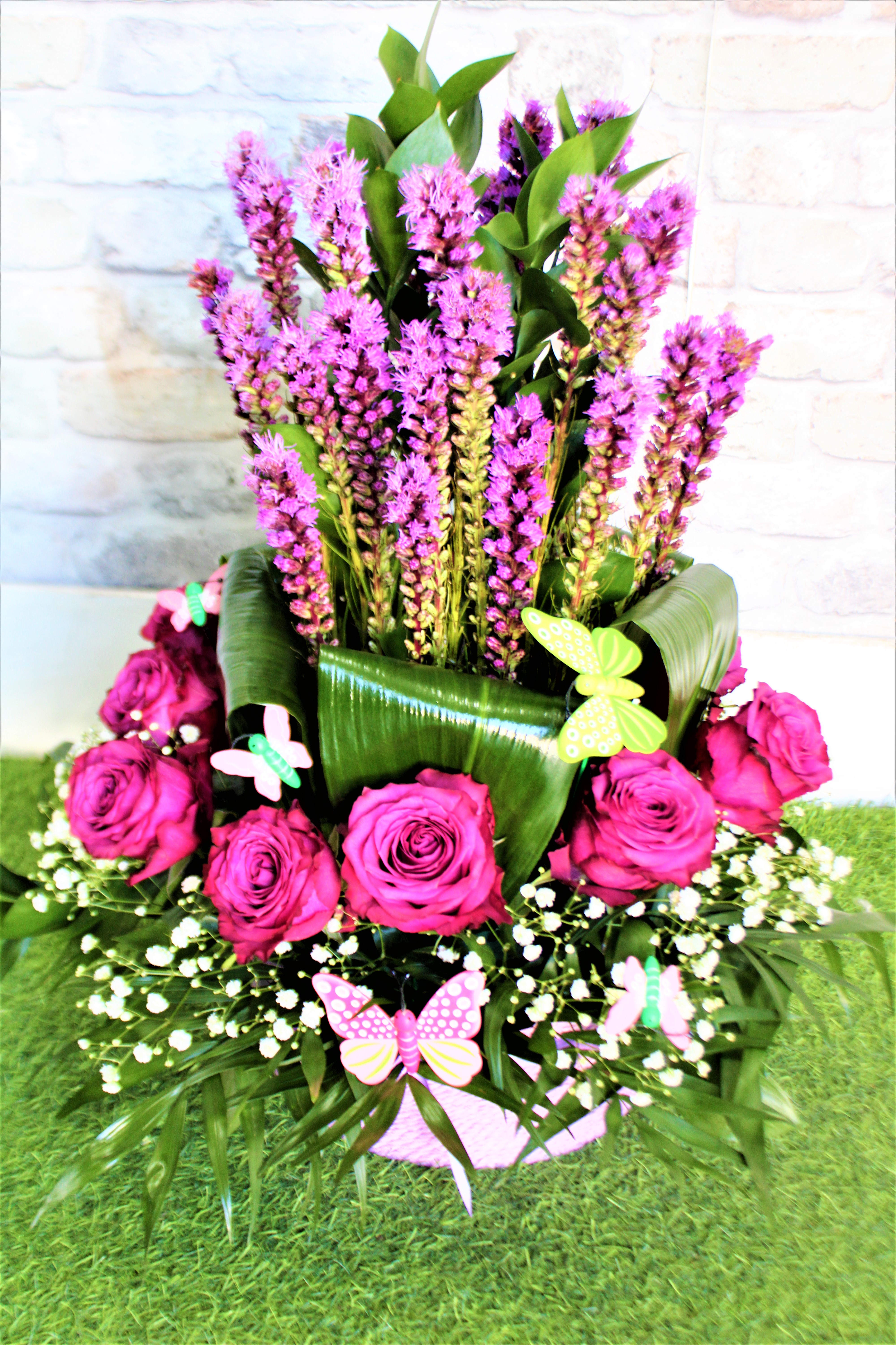 La composizione e composta da una ciotola in ceramica o cestino a Disponibilità del fiorista, Fiori freschi di stagione.