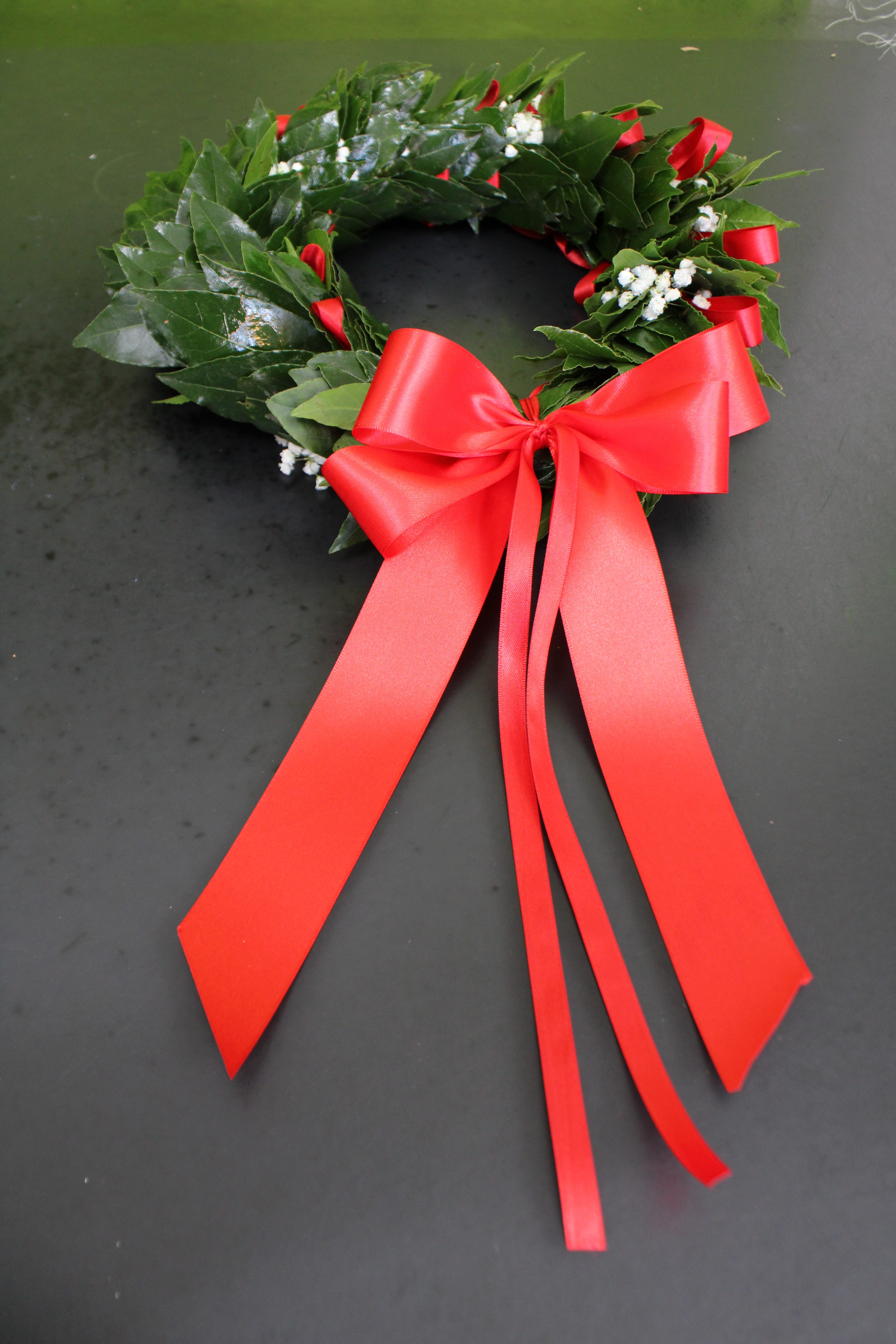 Coroncina realizzata con foglie di alloro fresche, Gipsofila, inserti di nastri di doppio raso del colore a vostra scelta e fiocco, verrร confezionata con unโelegante scatola. (come foto illustrativa)