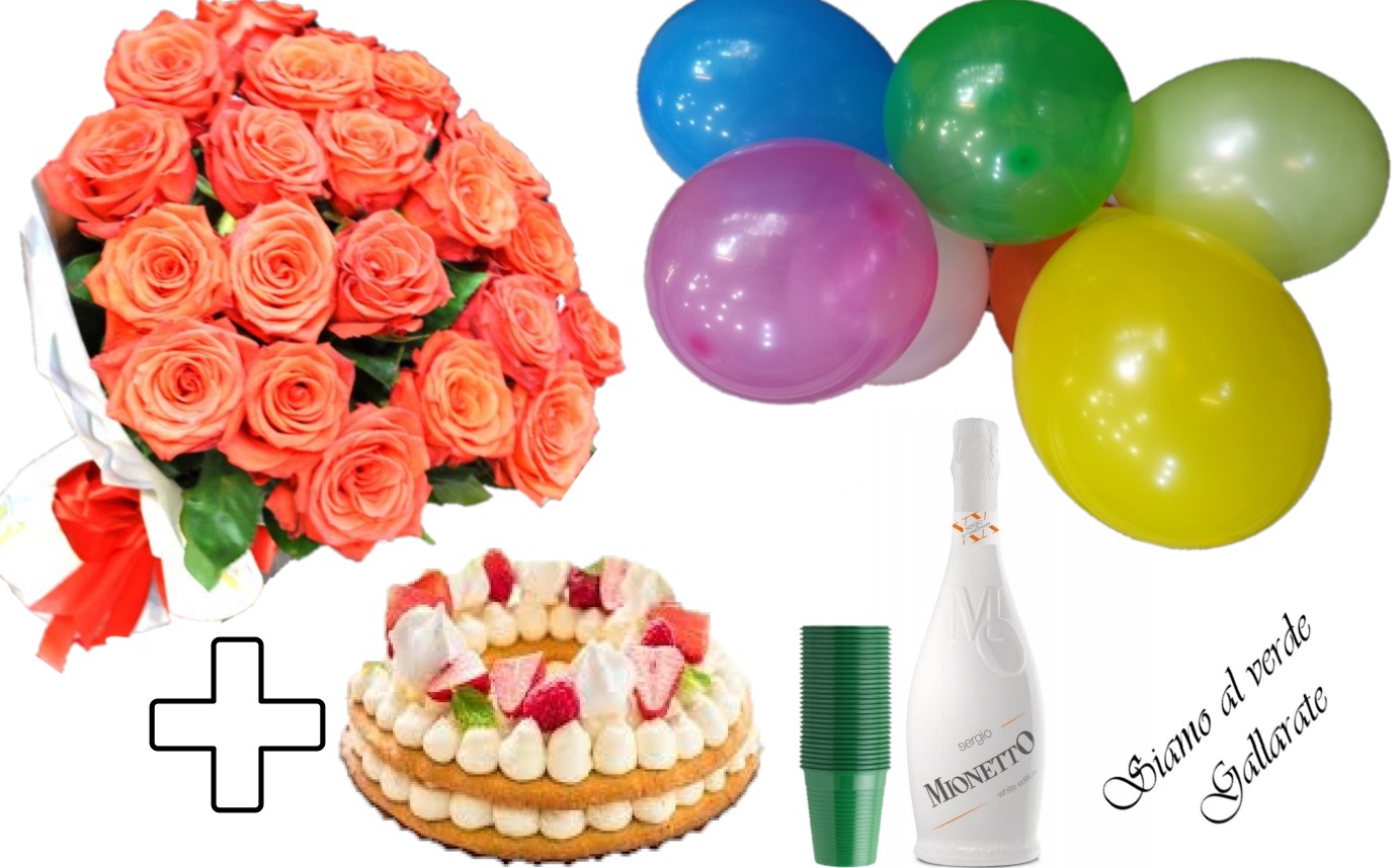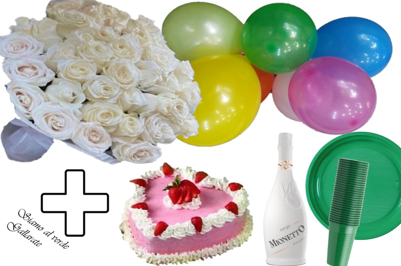 Festa a sorpresa e composto da un bellissimo mazzo di rose Fresche, Palloncini colorati Tanti auguri, Torta , bottiglia di Vino/spumante/prosecco, piatti e bicchieri, il tutto personalizzabile come preferite.