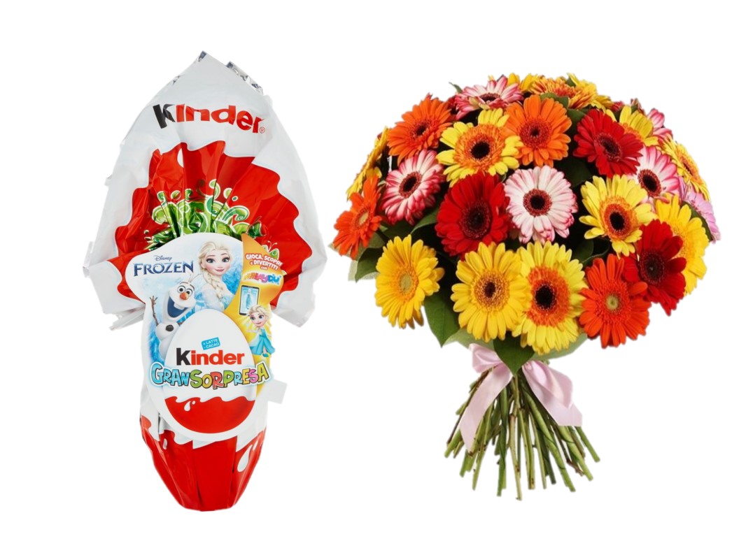 L’uovo di pasqua con gerbere è composto da un delizioso Uovo di Pasqua della Kinder a vostra scelta e Gerbere miste colorate, eucalipto e verde misto il tutto confezionato regalo.
